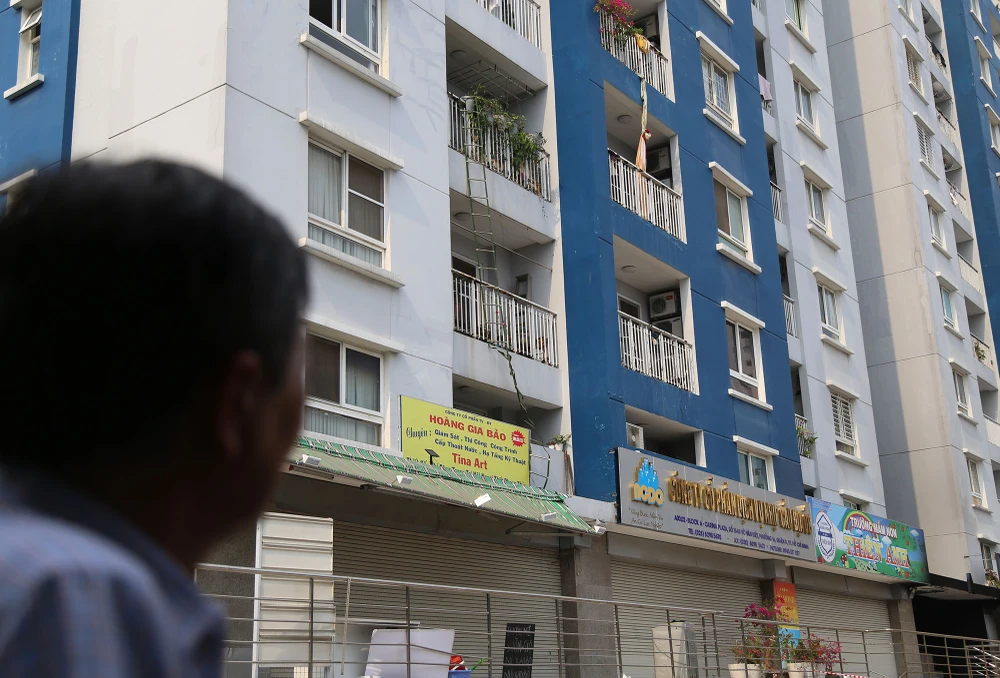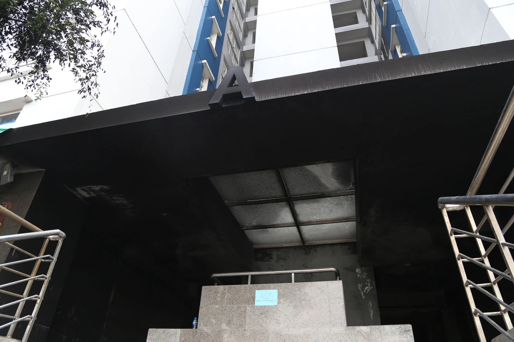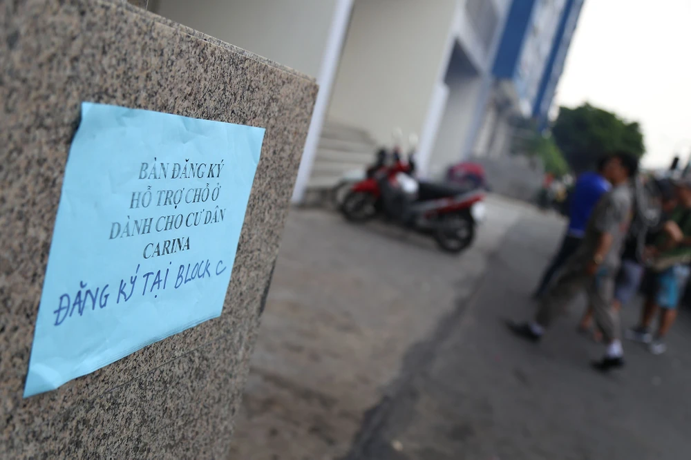 Bên ngoài tòa nhà có dán giấy đăng ký hỗ trợ chỗ ở cho cư dân tại Block C.