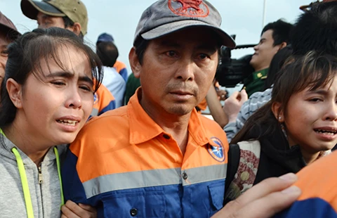Từ đầu giờ chiều, người thân của 34 ngư dân gặp nạn đã tập trung ken kín tại khu vực cầu cảng của Danang MRCC. Những ánh mắt lo lắng, buồn tủi nhìn về phía biển xa xăm.