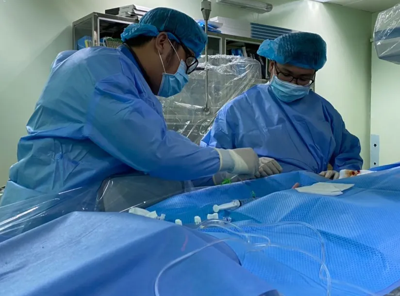 Các bác sĩ đang can thiệp mạch vành cứu sống ông N. Ảnh: BVCC