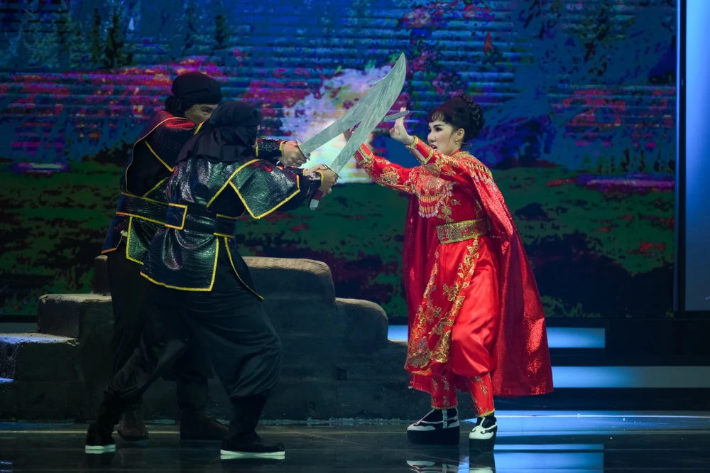 Khép lại đêm thi đầu tiên là một tiết mục cực kỳ hoành tráng và ấn tượng đến từ nghệ sĩ cải lương Diễm Kiều, cô lựa chọn biểu diễn trích đoạn về Nữ tướng Lê Chân của tác giả Tô Thiên Kiều.