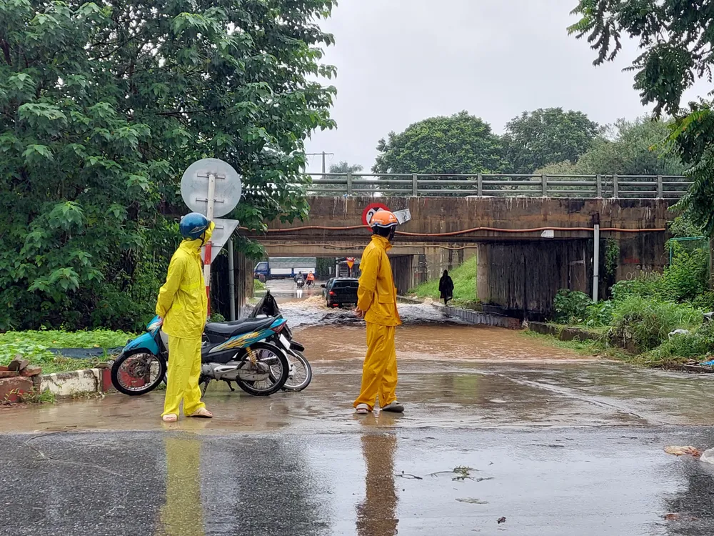 Nhân viên thoát nước có mặt tại điểm ngập để cảnh báo người dân đi đường. Ảnh: AH