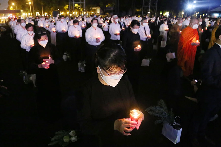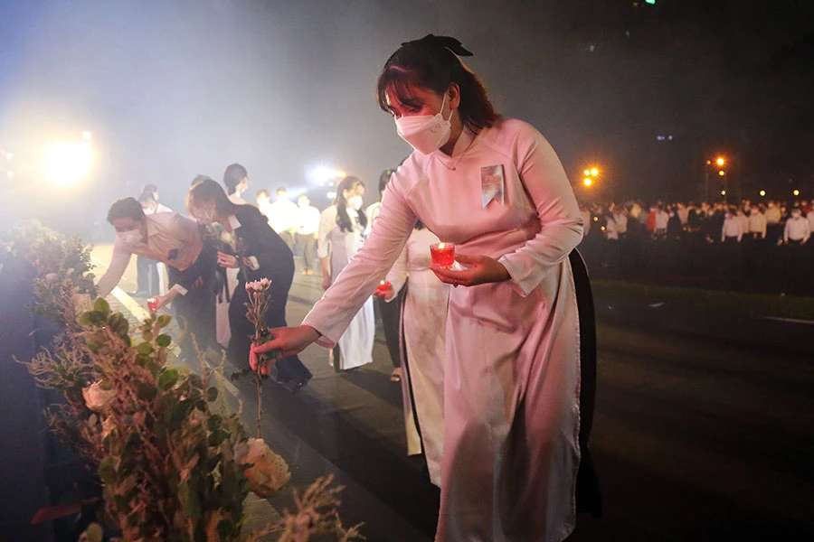 Các chùa ở TP.HCM thực hiện nghi thức thả đèn hoa đăng, thỉnh đại hồng chung; các nhà thờ và nhà nguyện trong Tổng giáo phận TP.HCM đồng loạt đổ chuông sầu khoảng 5 phút để cầu nguyện và tưởng nhớ đồng bào đã tử vong trong đại dịch. Trong ảnh: Người dự lễ tưởng niệm thắp nến và thả hoa đăng ở chùa Pháp Hoa, quận 3, TP.HCM. Ảnh: NGUYỆT NHI