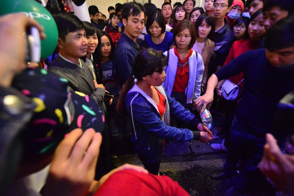 Người đi đường dùng nước lạnh giúp cô gái bị bỏng do bóng bay phát nổ. Ảnh: HUY KYO
