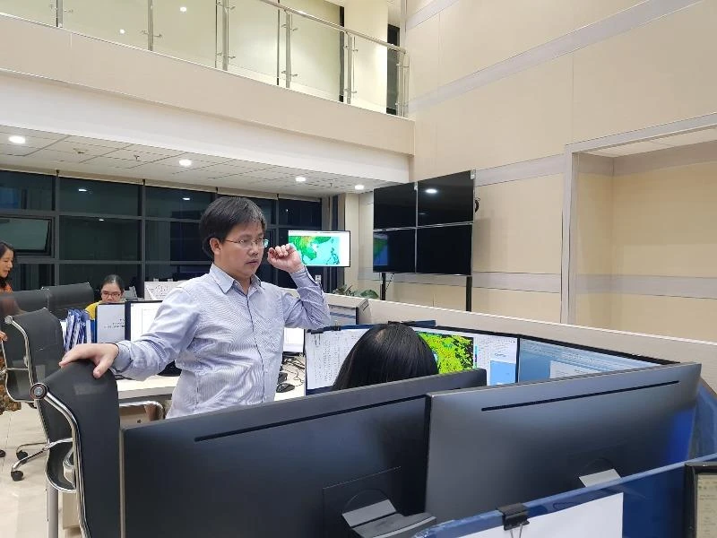 Ông Mai Văn Khiêm, Giám đốc Trung tâm Dự báo Khí tượng thủy văn Quốc gia trao đổi với các dự báo viên. Ảnh: AN HIỀN