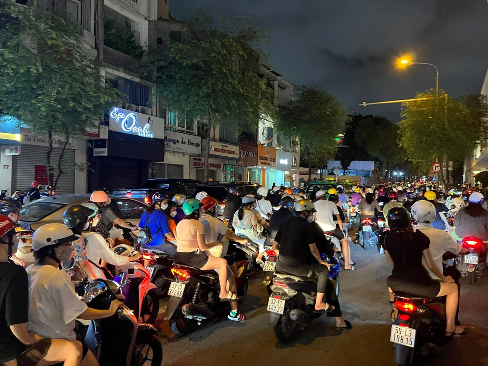 Tại đường Trần Hưng Đạo, quận 1, hàng loạt phương tiện ùn ứ, kéo dài cả cây số. Đa phần người dân đều đổ ra đường để vui đêm trung thu (15-8 Âm lịch).