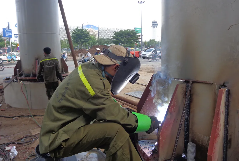 Ở phía dưới trụ đôi, công nhân hàn gia cố, bắt cứng thân trụ vào đế.