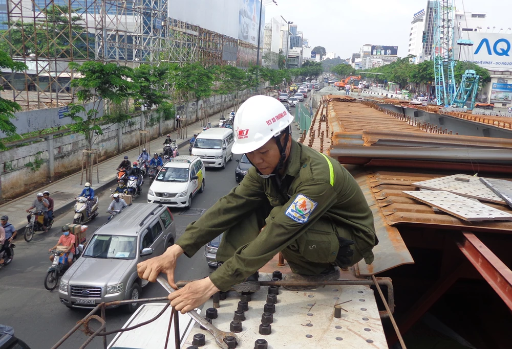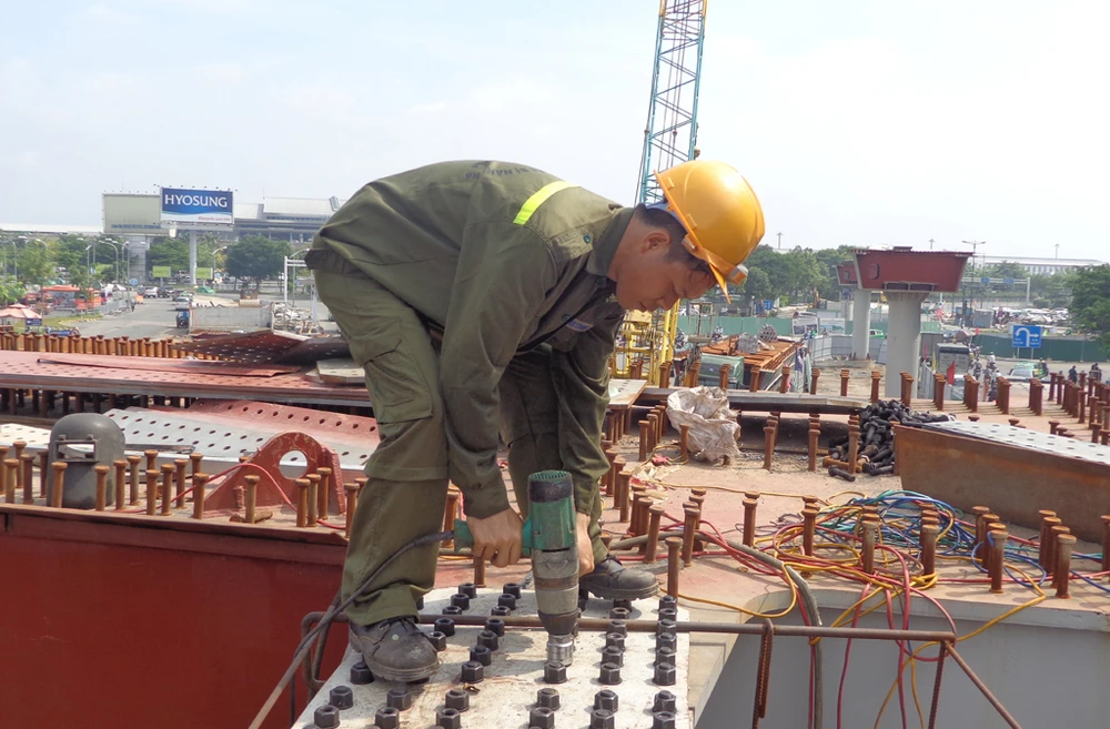 ... và dùng máy bắn bulông bằng điện bắt chết các bản nối kết các nhịp để chuẩn bị cho việc lao phóng nhịp dầm hộp tiếp theo sang các trụ chờ nối nhánh rẽ sang ga quốc tế.