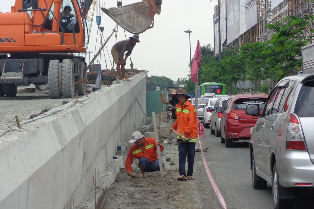 Ở phần tường chắn của đường dẫn đã được thi công xong và công nhân dọn dẹp rào chắn, hoàn thiện lại mặt đường bên hông để trả lại cho các dòng xe lưu thông mau lẹ vào sân bay.