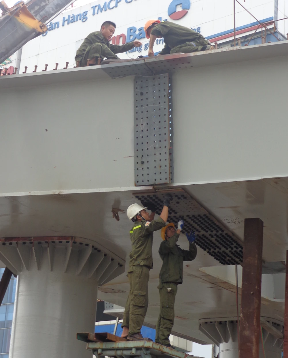 Các nhịp dầm hộp đã được gác lên hệ trụ, đà, xà mũ và được công nhân bắt chặt từng con bulông nối kết các bộ phận với nhau...