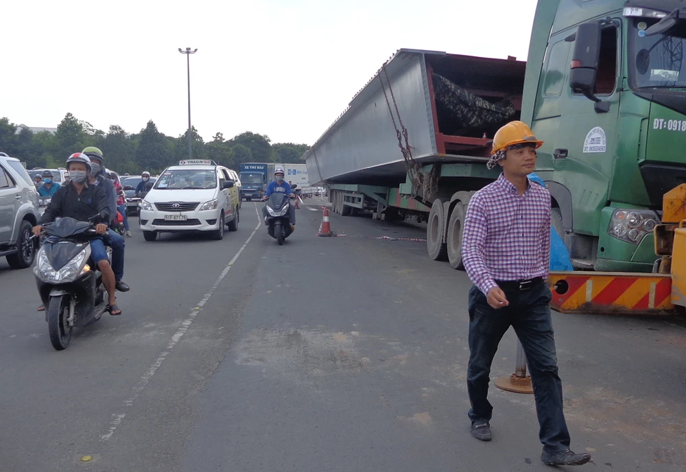 Những nhịp dầm hộp bằng thép dài 40-45 m, nặng 70-80 tấn được vận chuyển về công trình trong đêm trước để đêm sau sẽ được cẩu, lao lắp vào các trụ...