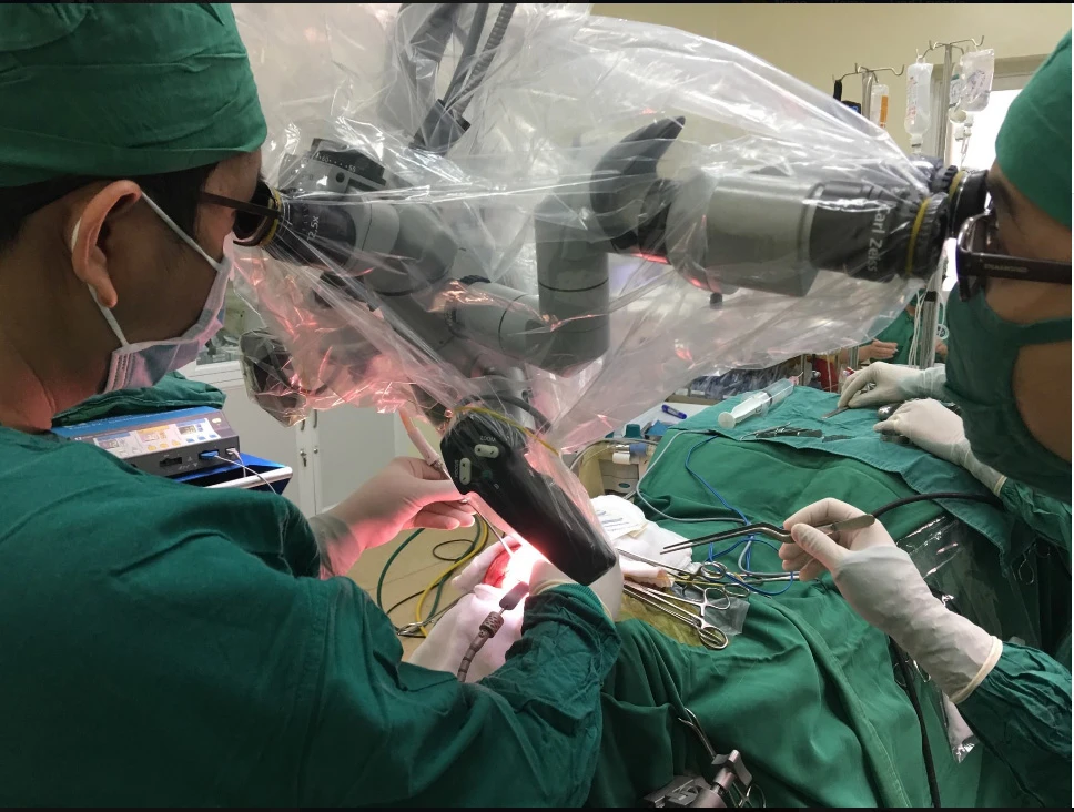 Kết quả chụp cắt lớp vi tính 160 lát cắt cho thấy ông D. bị xuất huyết não vùng bán cầu phải do tăng huyết áp nên buộc lên bàn mổ. Dưới sự trợ giúp của kính vi phẫu, các bác sĩ (BS) tiến hành mở sọ giải áp để lấy toàn bộ khối máu tụ ra ngoài rồi dùng máy đốt cầm máu não và đóng vết mổ từng lớp. Ca phẫu thuật kéo dài hơn bốn tiếng đồng hồ, bệnh nhân được truyền hai đơn vị máu.