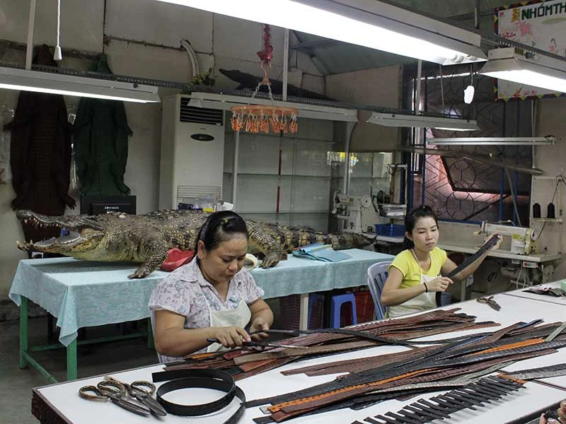 Ngành cá sấu đang gặp khó vì phụ thuộc quá lớn vào thị trường TQ. Trong ảnh: Chế biến da cá sấu tại một trang trại. Ảnh: QH