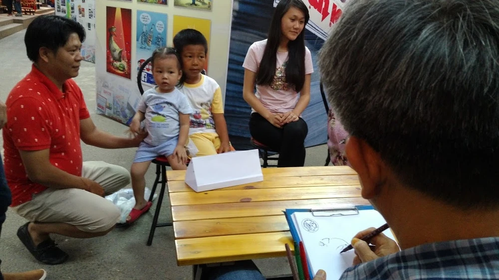 Khu vực vẽ chân dung miễn phí do các họa sĩ biếm thực hiện. Ảnh: Thanh Trang