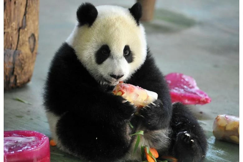 Gấu Yuan Zai ăn bánh sinh nhật năm 4 tuổi. Ảnh: CHINA DAILY