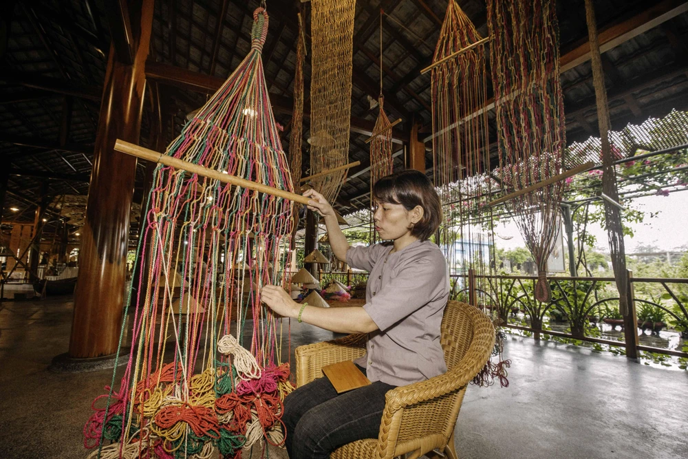 Trung tâm là ngôi nhà tròn, mái ngói, nơi tập trung triển lãm những sản phẩm của làng, nơi có sân khấu để giao lưu, tổ chức sự kiện. Tại đây, khách có thể thư giãn, mở mang tầm mắt, thu nhận nhiều kiến thức về những nghề thủ công sản xuất dụng cụ lao động (lưới, thuyền thúng, thuyền câu,…), vật gia dụng (nón lá, chiếu cói, bàn ghế mây và sợi tổng hợp, bàn ghế gỗ, đồ gỗ trang trí được chạm khắc rất tinh xảo,…), tác phẩm trang trí (12 con giáp, đàn chim yến đan bằng sợi tổng hợp, tượng gốm, tranh vẽ, thư hoạ, tranh cát, chuông gió, hoa đất sét, tò he,…), nhạc cụ (đàn ghi-ta, đàn đá, đàn T’rưng,…)…