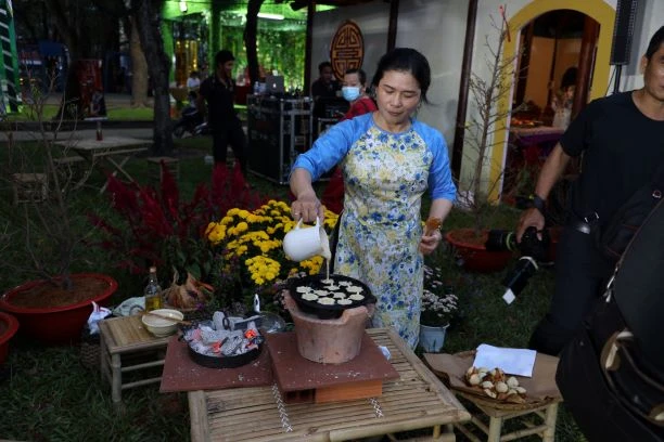 Nghệ nhân biểu diễn cách làm bánh thuẫn miền Trung.