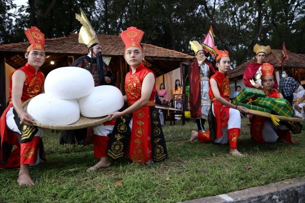 Sự tích bánh chưng bánh dày được sân khấu hoá giới thiệu đến khách tham quan.