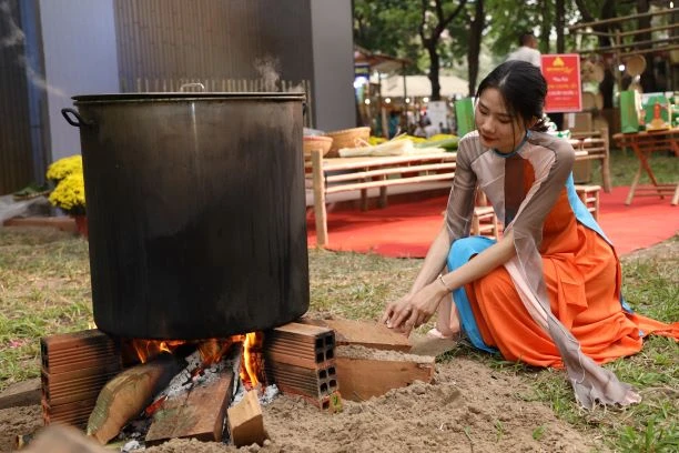 Bánh chưng được nấu trong không gian lễ hội Tết Việt .