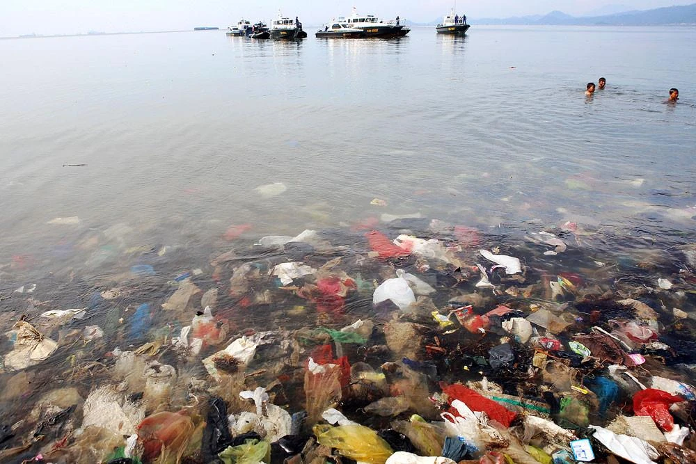 Rác thải nhựa được nhìn thấy chìm trong nước ở Vịnh Lampung, Indonesia. Ảnh: AFP