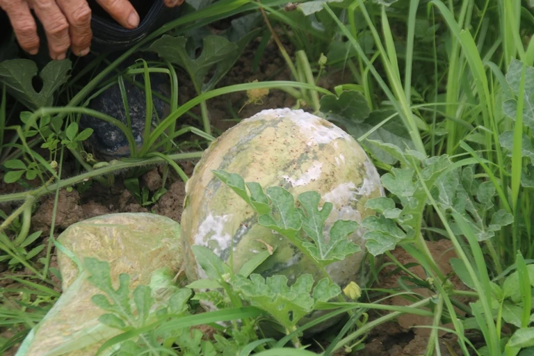 Dưa chín quá mức, không kịp thu hoạch vì thương lái không đến mua, dẫn đến hư hỏng.