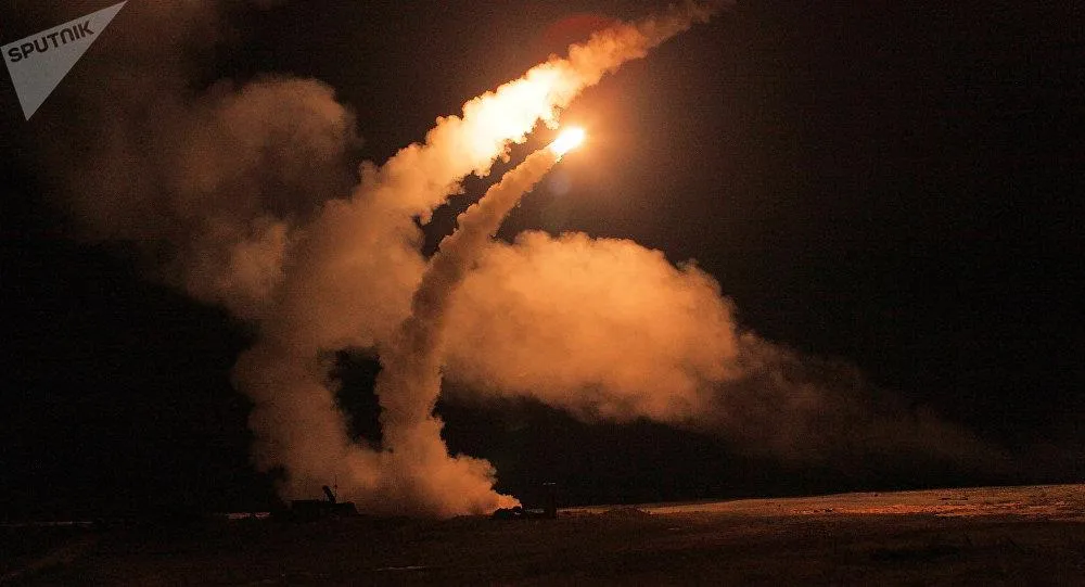Một vụ thử nghiệm hệ thống S-400 Triumf ở trường bắn Ashuluk, vùng Astrakhan trong cuộc tập trận chiến thuật của Lực lượng phòng thủ vũ trụ Nga. Ảnh: SPUTNIK