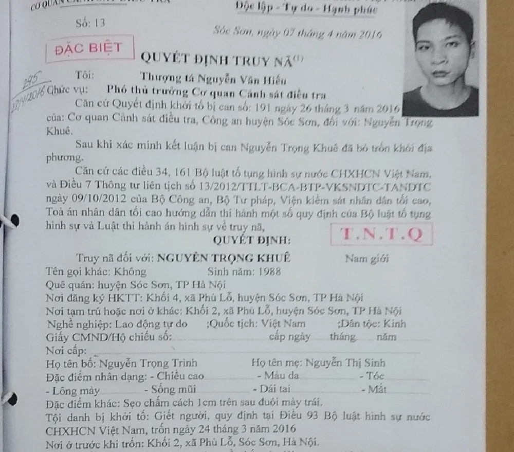 Ngày 7-4-2016, xác định Khuê đã bỏ trốn, Cơ quan CSĐT Công an huyện Sóc Sơn đã ra quyết định truy nã toàn quốc Khuê về tội giết người.