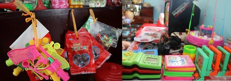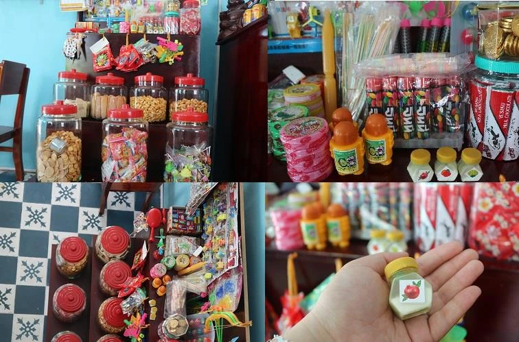 Bên cạnh đó, các món bánh kẹo, đồ chơi được chủ quán kiên nhẫn tìm kiếm khắp nơi. Đặc biệt có món đồ chơi được lấy từ một quán tạp hóa nhỏ ở Đức Trọng (Lâm Đồng).