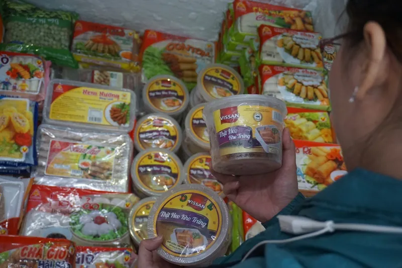 Trong khi đó, tại các cửa hàng hệ thống Vissan hiện đang bày bán thịt heo kho trứng đóng hộp sẵn.