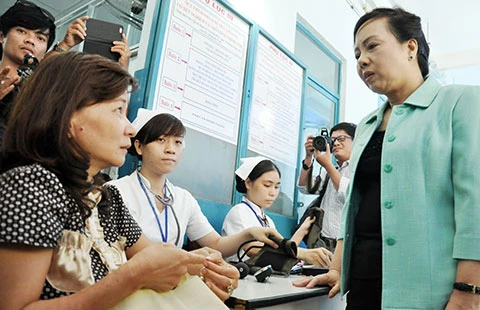 Bộ trưởng Bộ Y tế thăm hỏi người dân tham gia khám BHYT tại BV quận Bình Thạnh. Ảnh: TÙNG SƠN