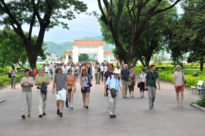 Du khách quốc tế dâng hương tại khu điện thờ Tây Sơn Tam Kiệt thờ ba vị anh hùng Nguyễn Huệ, Nguyễn Nhạc, Nguyễn Lữ và các văn thần võ tướng của nhà Tây Sơn.