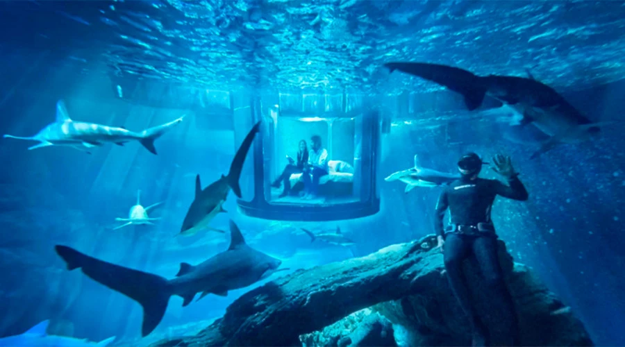 Du khách lần đầu có cơ hội được ngủ chung với 35 chú cá mập. Nguồn: RT