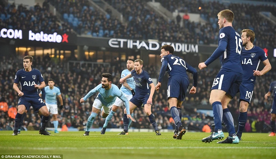 Phút 14, từ quả đá phạt góc, tiền vệ phòng ngự thấp bé người Đức Gundogan vượt qua bức tường phòng ngự của Tottenham đánh đầu vào góc xa mở tỉ số 1-0 cho Man. City.