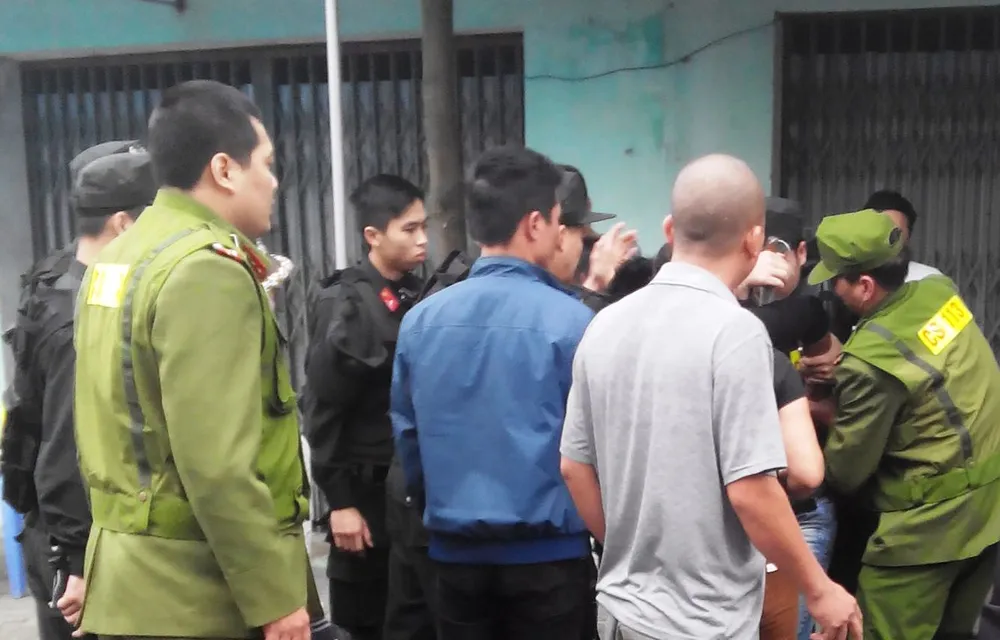 Lực lượng chức năng đang trấn áp một đối tượng gây rối trong khu vực phân luồng bảo vệ Lễ khai ấn.