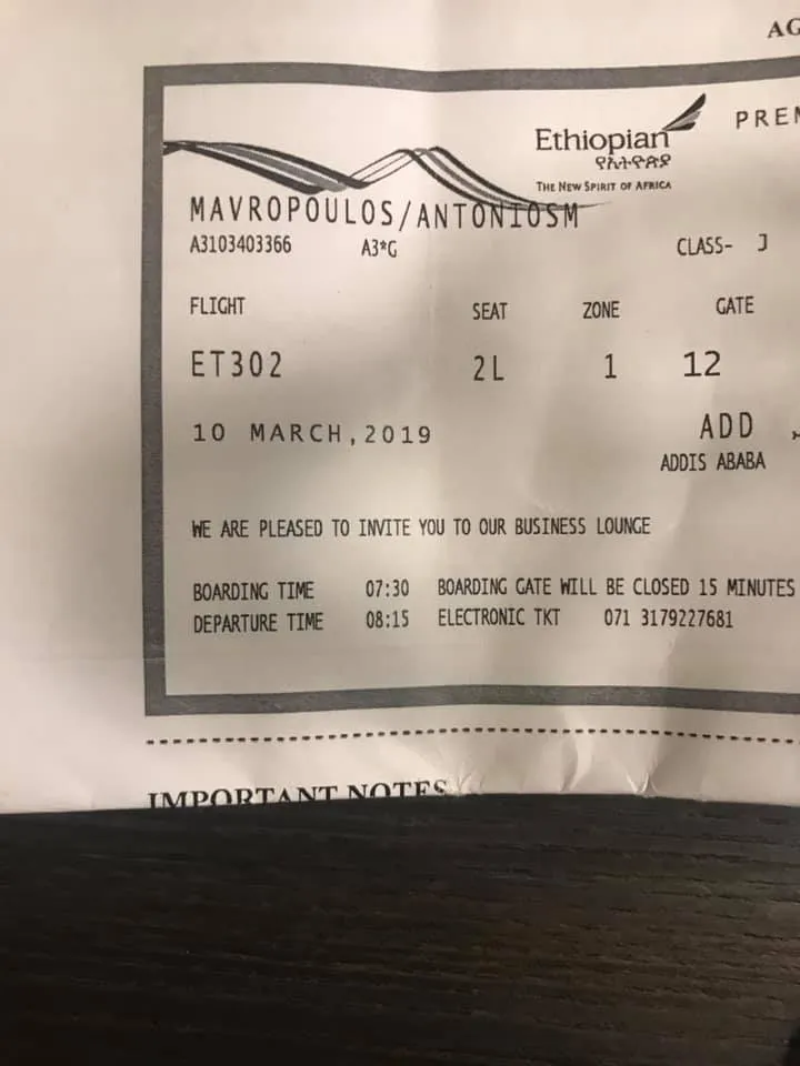 Vé máy bay của ông Antonis Mavropoulos, dự kiến sẽ đi chuyến bay xấu số ET 302 của hãng hàng không Ethiopian Airlines ngày 10-3. Ảnh: FACEBOOK