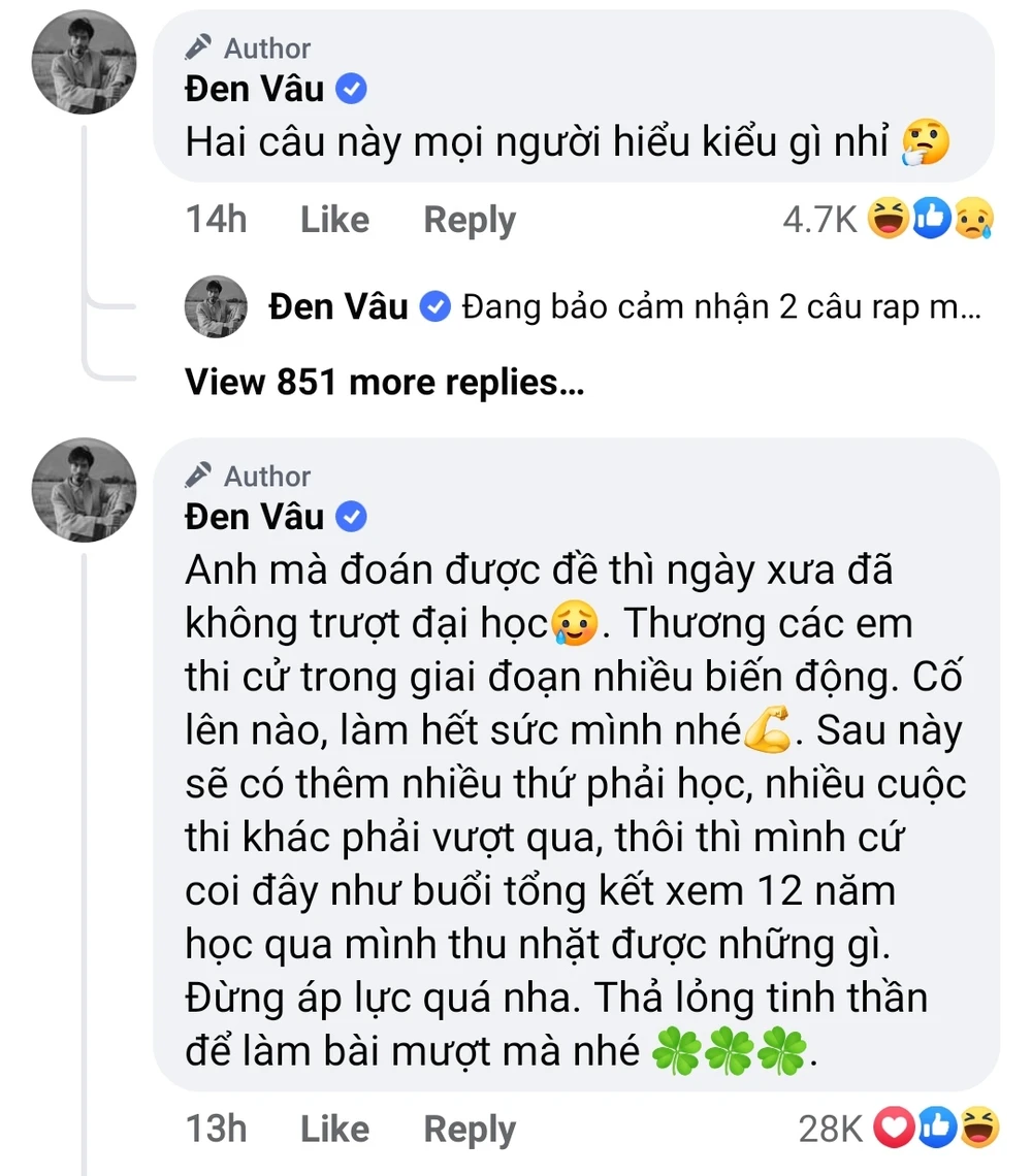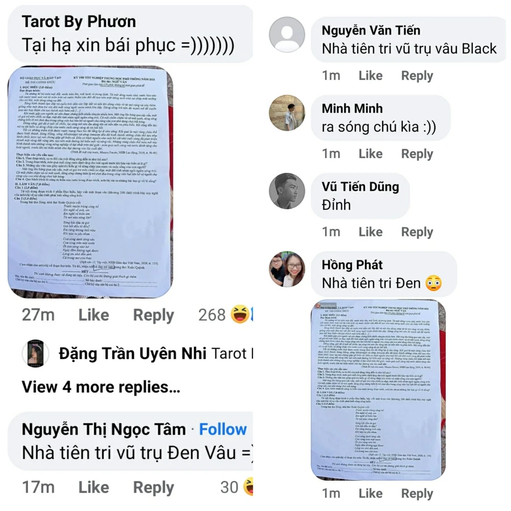 Anh Nguyễn Cảnh An (22 tuổi, TP Thủ Đức) cũng bày tỏ sự bất ngờ khi biết Đen Vâu lại tiếp tục đoán trúng đề Văn năm nay. "Sau năm đầu Đen Vâu đoán trúng đề, năm nào tới gần kỳ thi THPT tôi cũng đều theo dõi xem anh chàng này có ra thêm bài mới hay không. Thật không thể tin được 3 năm liên tiếp Đen Vâu đoán trúng đề như vậy. Đen Vâu bằng cách này hay cách khác có một mối liên hệ biện chứng sâu sắc với đề thi văn THPT. Tôi nghĩ sang năm các thí sinh nên liên hệ với Đen Vâu để tham khảo ý kiến "tiên tri" - Cảnh An cười nói vui.