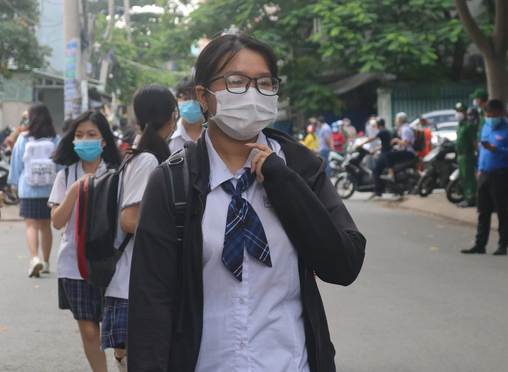 Thí sinh ra về tại điểm trường THPT Bình Hưng Hòa (quận Bình Tân). Ảnh: KHÁNH CHI