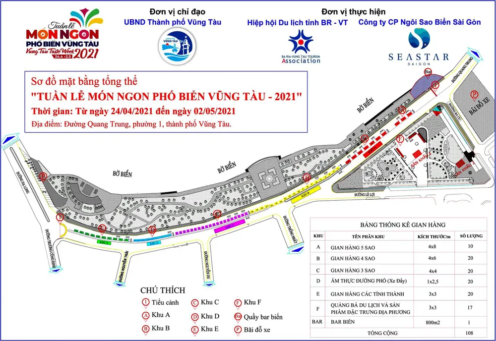 Dự kiến sẽ có 108 gian hàng trong đó có khoảng hơn 80 gian hàng trưng bày và phục vụ khách tham quan thưởng thức các món ăn ngon, đặc sản của TP Vũng Tàu, tỉnh Bà Rịa - Vũng Tàu, các vùng miền trên cả nước và món ngon tiêu biểu của nước ngoài. Bên cạnh đó là các gian hàng giới thiệu quảng bá sản phẩm đặc sản địa phương và quảng bá du lịch, danh lam thắng cảnh của tỉnh Bà Rịa - Vũng Tàu…
