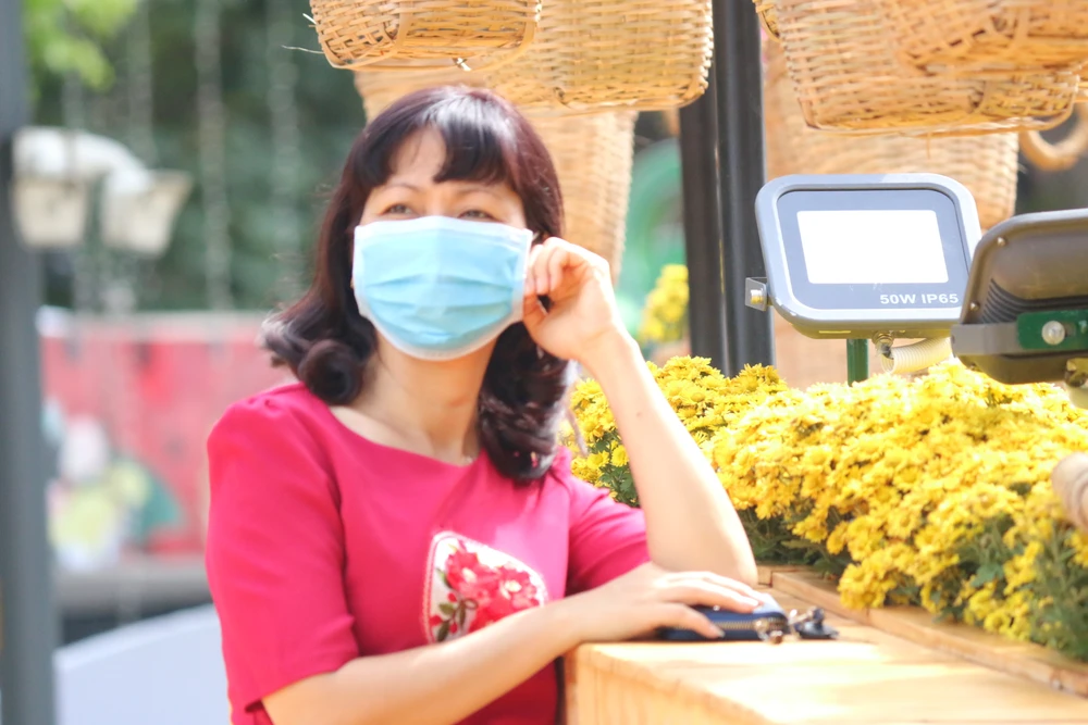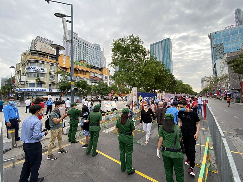 Các biện pháp nghiêm ngặt trong phòng dịch được áp dụng ngay từ ngày đầu đường hoa Nguyễn Huệ mở cửa đón khách tham quan. Người dân chủ động mang khẩu trang đầy đủ khi tới thưởng lãm.