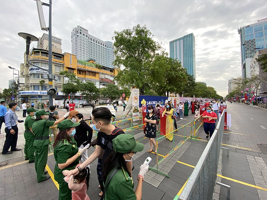 Ngay từ cổng vào, đoàn người xếp hàng dài theo thứ tự, được kiểm tra đo thân nhiệt hai lần, rửa tay sát khuẩn trước khi vào đường hoa.