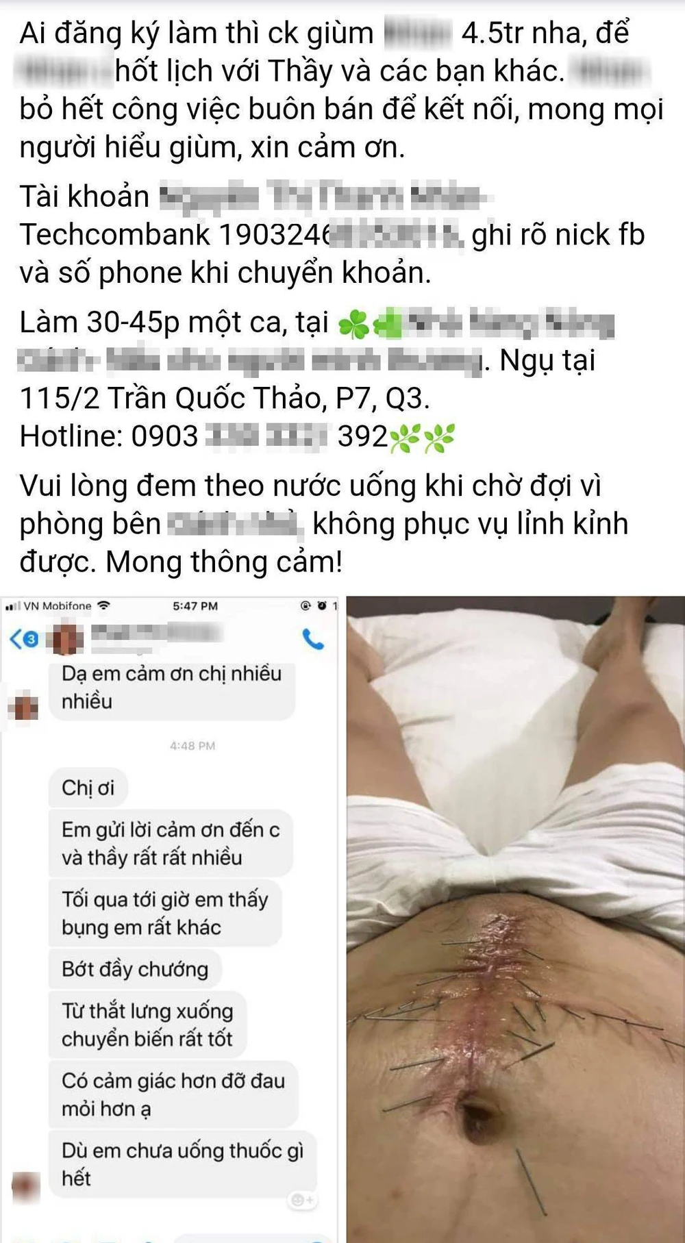 Theo đó, người trị bệnh sẽ trải qua nhiều lần châm cứu chi chít xung quanh vết sẹo, mỗi lần châm cứu 30-45 phút. Người quản lý trang fangape này cũng chính là người “dắt mối” và thu tiền khi chị em có ý định trị vết “sẹo ác quỷ” sau khi mổ sinh.