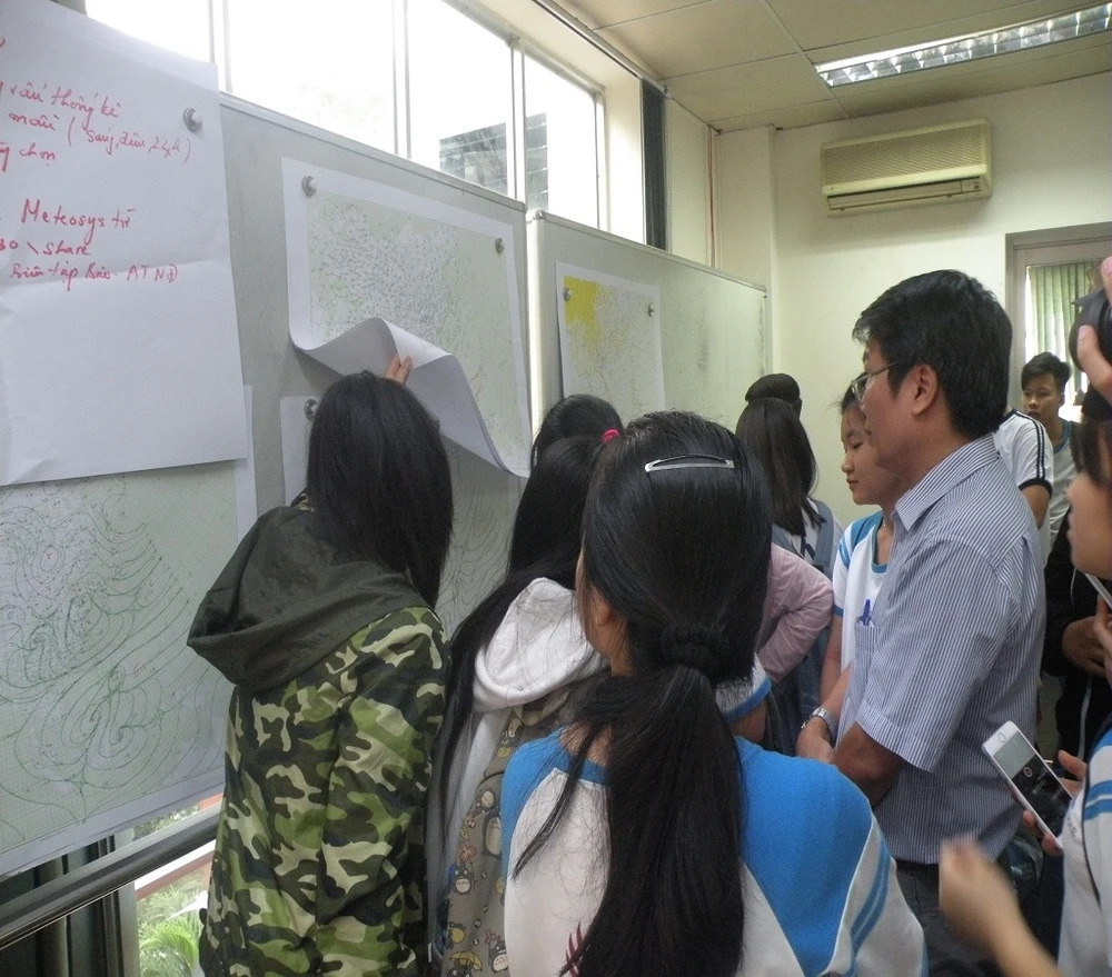 Sau khi nghe thuyết trình, các em được đi xem một số thiết bị quan trắc (thùng vũ lượng kế, lều kế), được tham quan không gian làm việc cũng như nhìn thấy các công cụ (bản đồ, ảnh mây vệ tinh) dùng cho công việc dự báo thời tiết.
