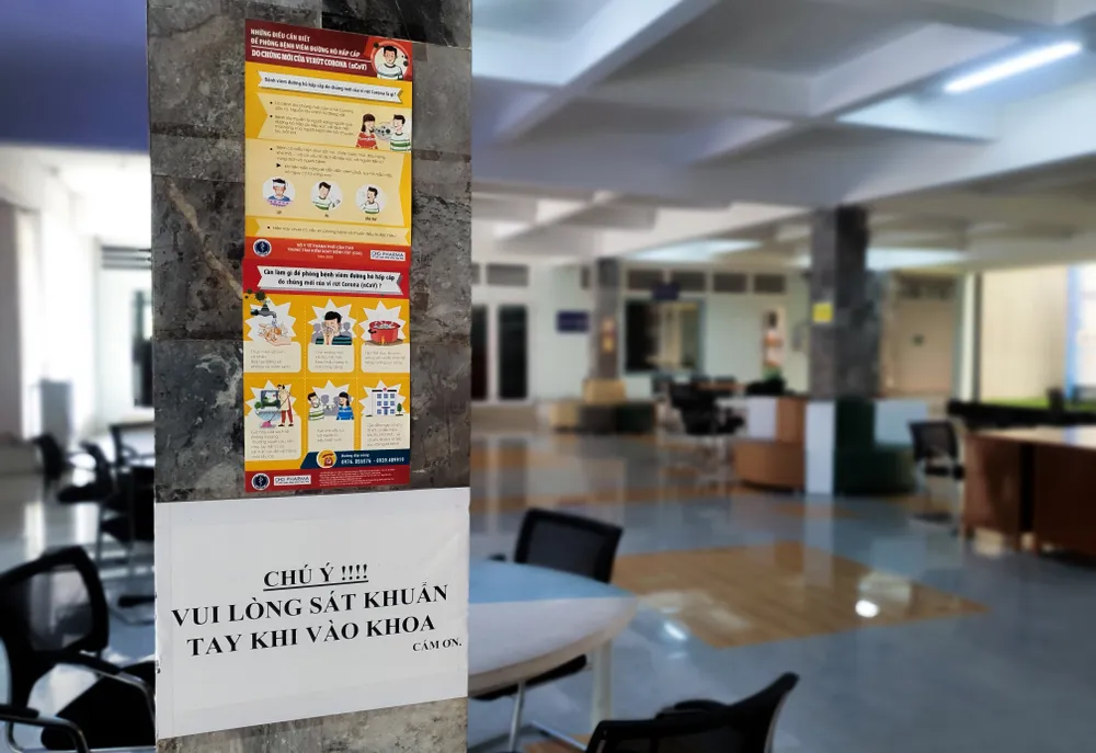 Khuyến cáo đeo khẩu trang và rửa tay bằng dung dịch sát khuẩn được đặt tại cửa vào các khoa, phòng học để nhắc nhở sinh viên. Ảnh: CHÂU ANH