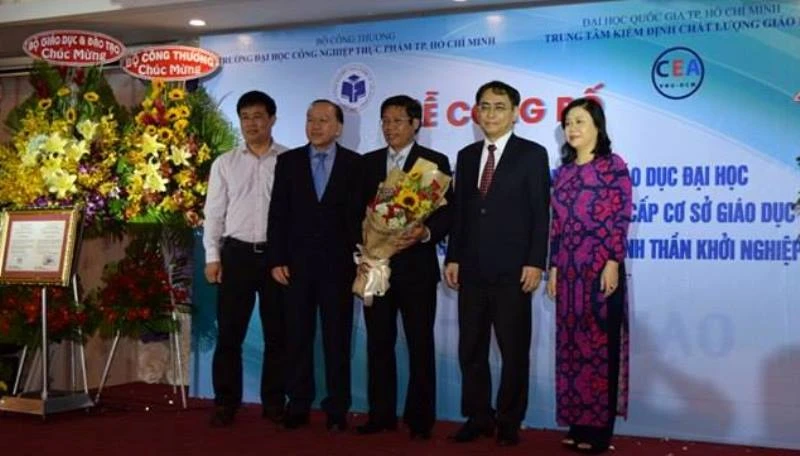 PGS-TS Nguyễn Xuân Hoàn, Phó Hiệu trưởng phụ trách Trường ĐH Công nghiệp thực phẩm TP.HCM (đứng giũa) đón nhận đạt chuẩn chất lượng giáo dục. Ảnh: AN NHIÊN