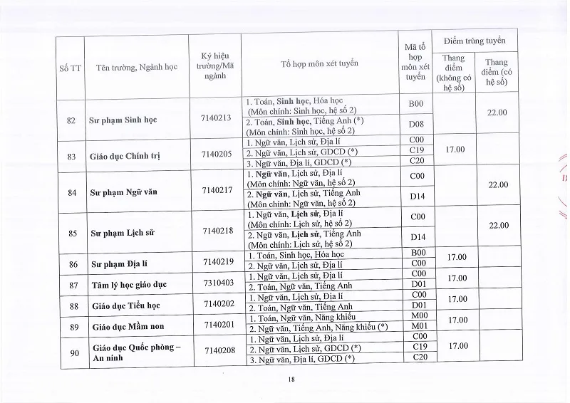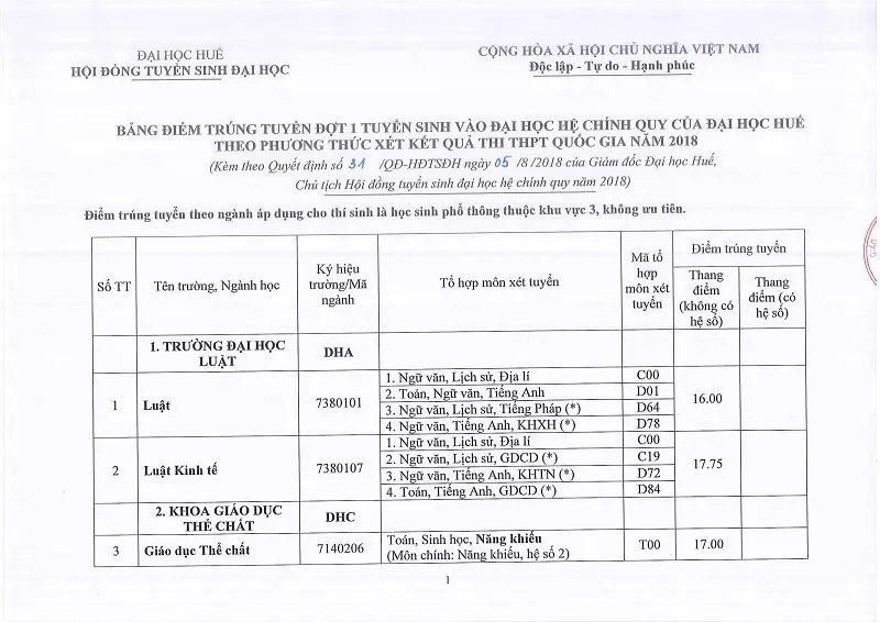 Dưới đây là chi tiết về điểm trúng tuyển đợt 1 tuyển sinh hệ chính quy của ĐH Huế theo phương thức xét kết quả thi THPT quốc gia năm 2018.