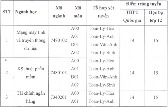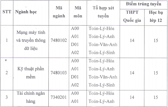 Trường công bố mức điểm chuẩn 14 điểm với phương thức điểm thi THPT quốc gia và 15 điểm với cách xét học bạ cho tất cả ngành.