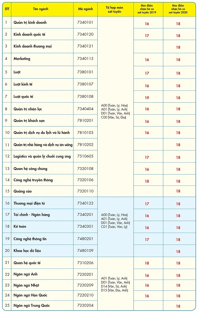 Năm nay, trường tuyển 2.790 chỉ tiêu ở 25 ngành đào tạo. Trường mở thêm năm ngành mới, gồm: Kinh doanh thương mại, Quản trị nhà hàng và dịch vụ ăn uống, Khoa học dữ liệu, Quảng cáo, Ngôn ngữ Trung Quốc.