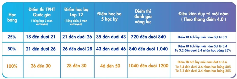 Với chính sách học bổng không giới hạn số lượng, trung bình mỗi năm trường chi khoảng 50 tỉ đồng cho các gói học bổng 100%, 50%, 40%, 25% giá trị học phí. Năm 2020, trường tiếp tục áp dụng chính sách đặc biệt này. Cụ thể như sau: