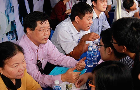 Cán bộ ĐH Luật TP.HCM đang tư vấn cho thí sinh. Ảnh: PĐ
