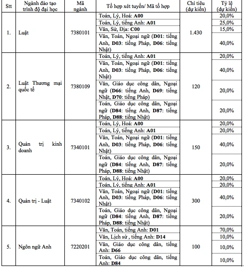 + Môn tiếng Anh: Đối với ngành Quản trị - Luật, Quản trị kinh doanh, Luật, Luật Thương mại quốc tế và Ngôn ngữ Anh.