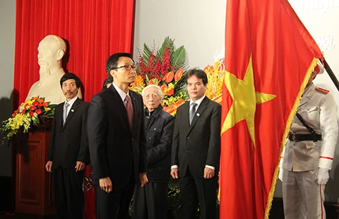 Phó Thủ tướng Vũ Đức Đam thay mặt Chủ tịch nước trao tặng huân chương Hồ Chí Minh cho Trường ĐH Mỹ thuật Việt Nam. Ảnh: VIẾT LONG